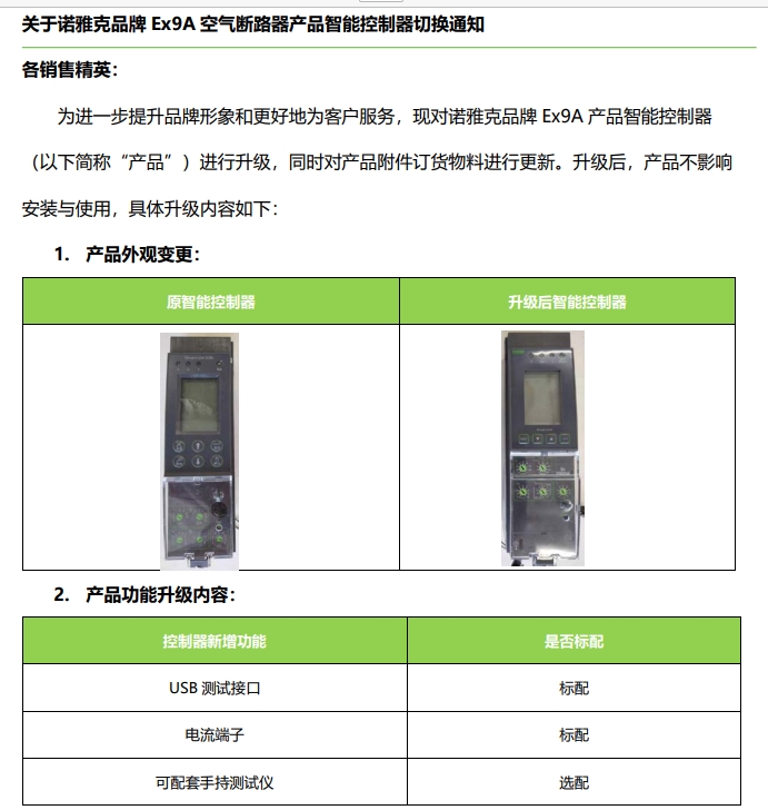 關(guān)于諾雅克品牌 Ex9A 空氣斷路器產(chǎn)品智能控制器切換通知