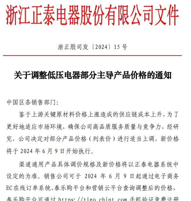 關(guān)于調(diào)整低壓電器部分主導(dǎo)產(chǎn)品價(jià)格的通知 -浙正股司發(fā)〔2024〕15 號(hào)