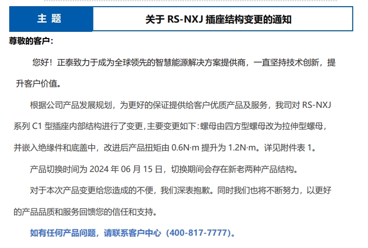 關(guān)于 RS-NXJ 插座結(jié)構(gòu)變更的通知