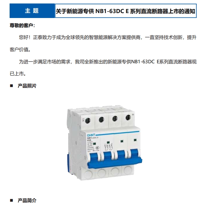 關(guān)于新能源專供 NB1-63DC E 系列直流斷路器上市的通知