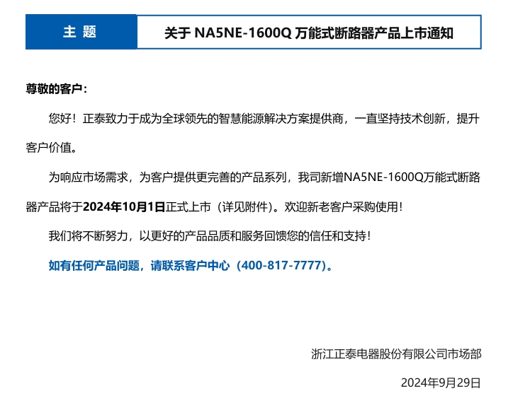 關(guān)于NA5NE-1600Q萬能式斷路器產(chǎn)品上市通知
