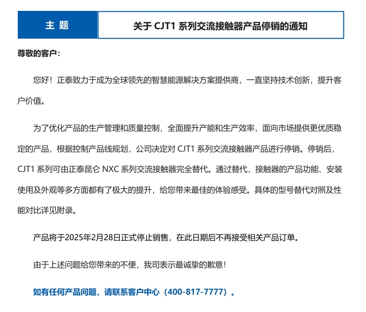 關于CJT1系列交流接觸器產(chǎn)品停銷的通知
