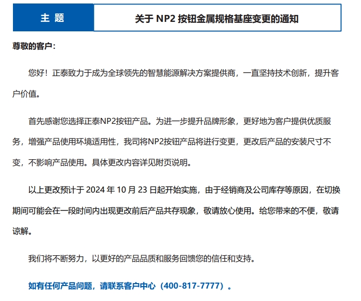 關(guān)于 NP2 按鈕金屬規(guī)格基座變更的通知