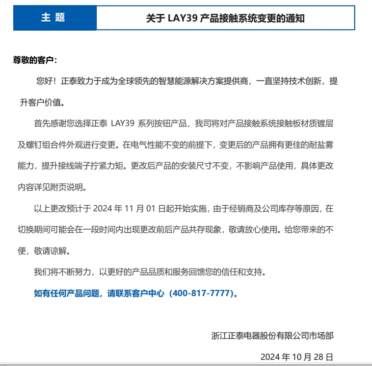 關(guān)于 LAY39 產(chǎn)品接觸系統(tǒng)變更的通知