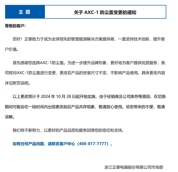 關(guān)于 AXC-1 防塵蓋變更的通知