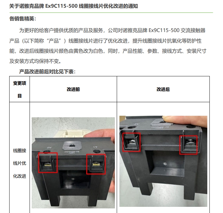 關于諾雅克品牌 Ex9C115-500 線圈接線片優(yōu)化改進的通知
