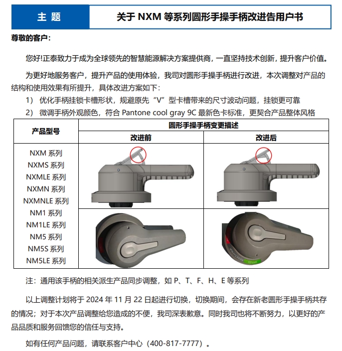 關(guān)于 NXM 等系列圓形手操手柄改進告用戶書