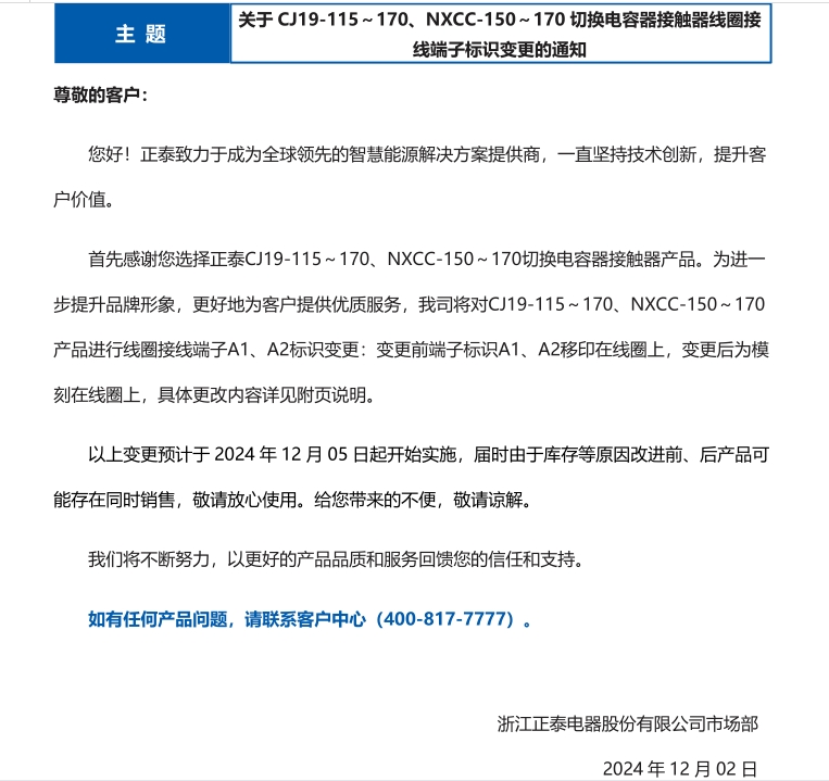 關于 CJ19-115~170、NXCC-150~170 切換電容器接觸器線圈接 線端子標識變更的通知