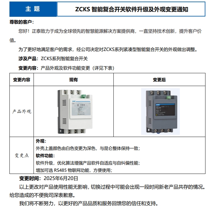 ZCKS 智能復(fù)合開關(guān)軟件升級及外觀變更通知