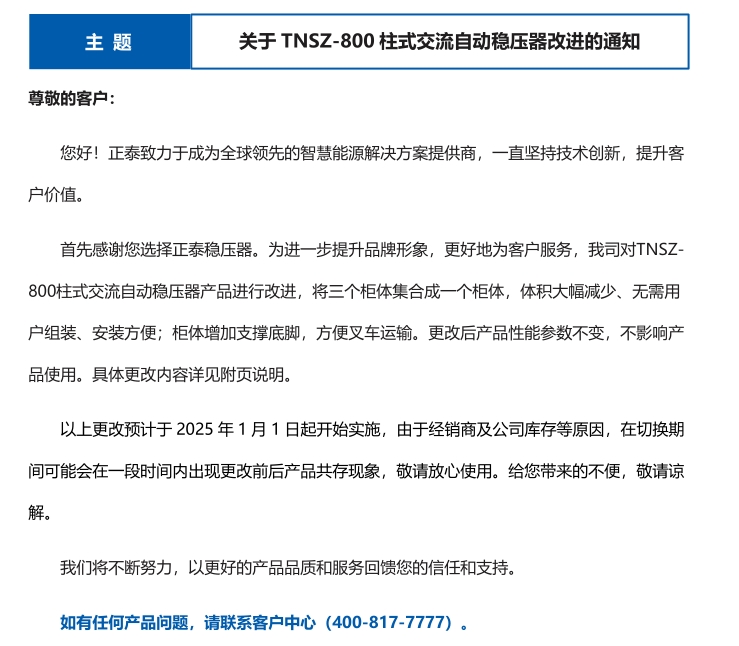 關(guān)于 TNSZ-800 柱式交流自動(dòng)穩(wěn)壓器改進(jìn)的通知