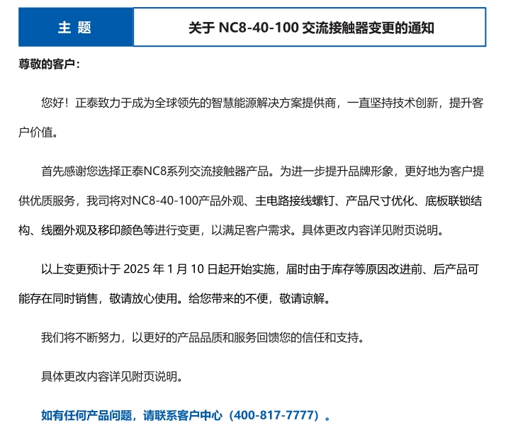 關(guān)于 NC8-40-100 交流接觸器變更的通知