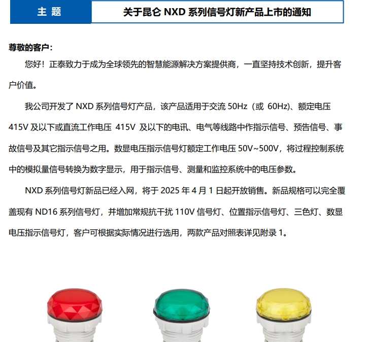 關(guān)于昆侖 NXD 系列信號(hào)燈新產(chǎn)品上市的通知