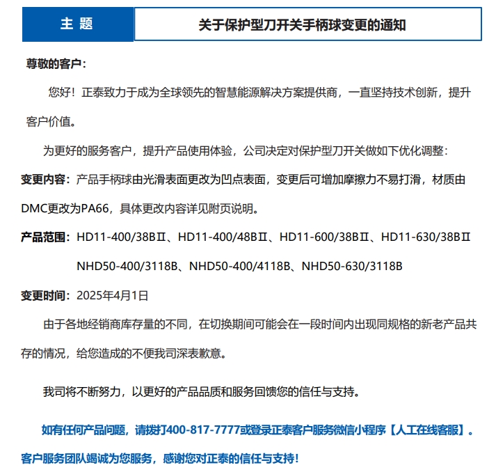 關(guān)于 HD11-100~400A 保護(hù)型刀開(kāi)關(guān)變更的通知