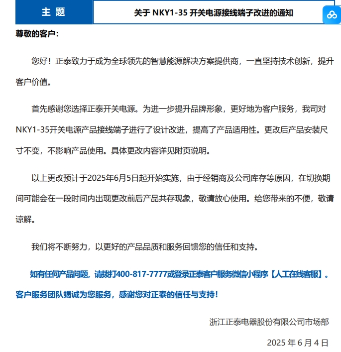 關(guān)于 NKY1-35 開關(guān)電源接線端子改進的通知