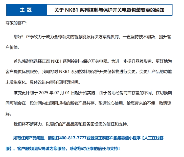 關(guān)于 NKB1 系列控制與保護(hù)開關(guān)電器包裝變更的通知
