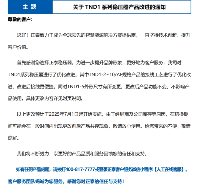 關(guān)于 TND1 系列穩(wěn)壓器產(chǎn)品改進(jìn)的通知