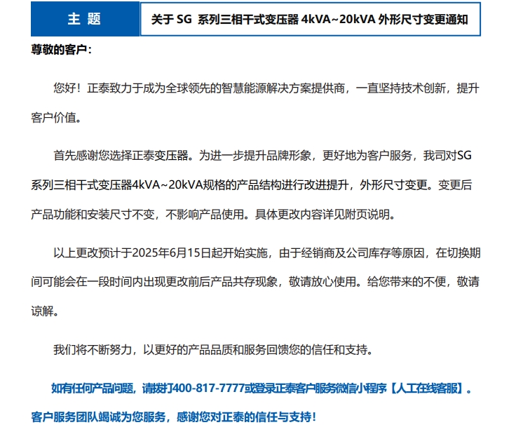關(guān)于 SG 系列三相干式變壓器 4kVA~20kVA 外形尺寸變更通知