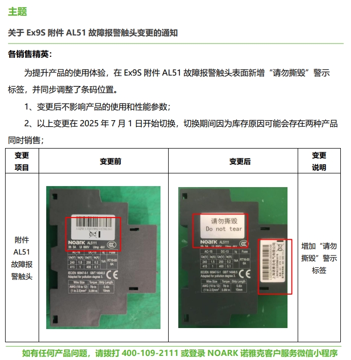 關于 Ex9S 附件 AL51 故障報警觸頭變更的通知