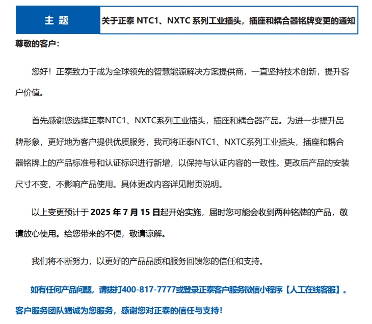 關(guān)于正泰 NTC1、NXTC 系列工業(yè)插頭,插座和耦合器銘牌變更的通知
