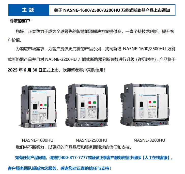 關(guān)于 NA5NE-1600/2500/3200HU 萬能式斷路器產(chǎn)品上市通知