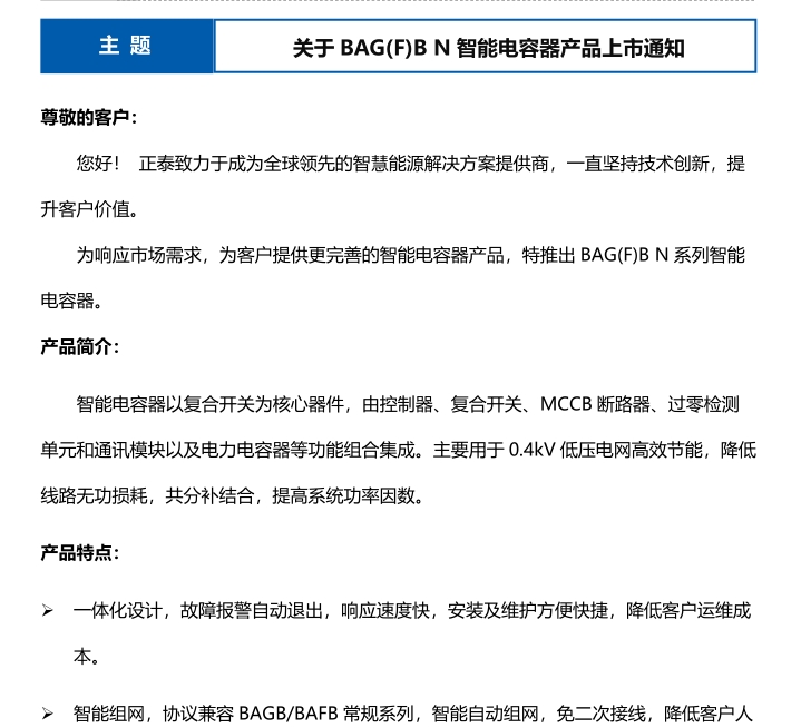 關(guān)于 BAG(F)B N 智能電容器產(chǎn)品上市通知