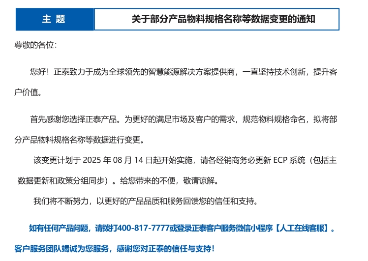 關(guān)于部分產(chǎn)品物料規(guī)格名稱等數(shù)據(jù)變更的通知