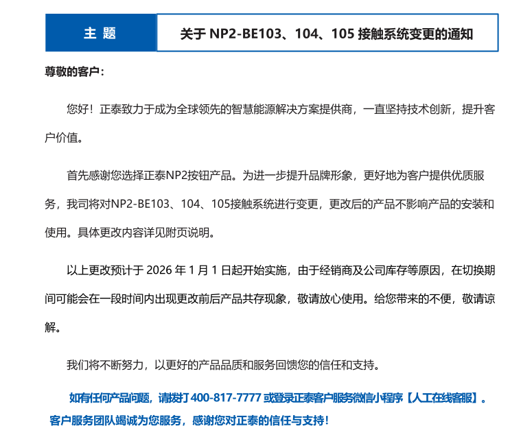 關(guān)于 NP2-BE103、104、105 接觸系統(tǒng)變更的通知