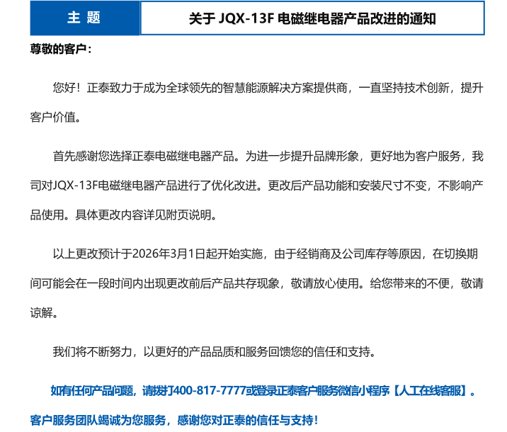 關(guān)于 JQX-13F 電磁繼電器產(chǎn)品改進(jìn)的通知